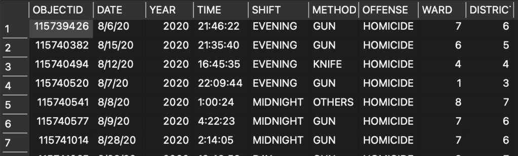 After I finished up the last project on DC’s homicides by police work shift and ward, I decided I wanted to use SQL to clean the data a little more, and this time analyze the method used to commit the homicides.