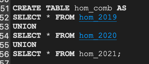 In any event, I’m going to save these values into a new table called hom_tot_year which I will export as a .csv to mess with for visualizations.