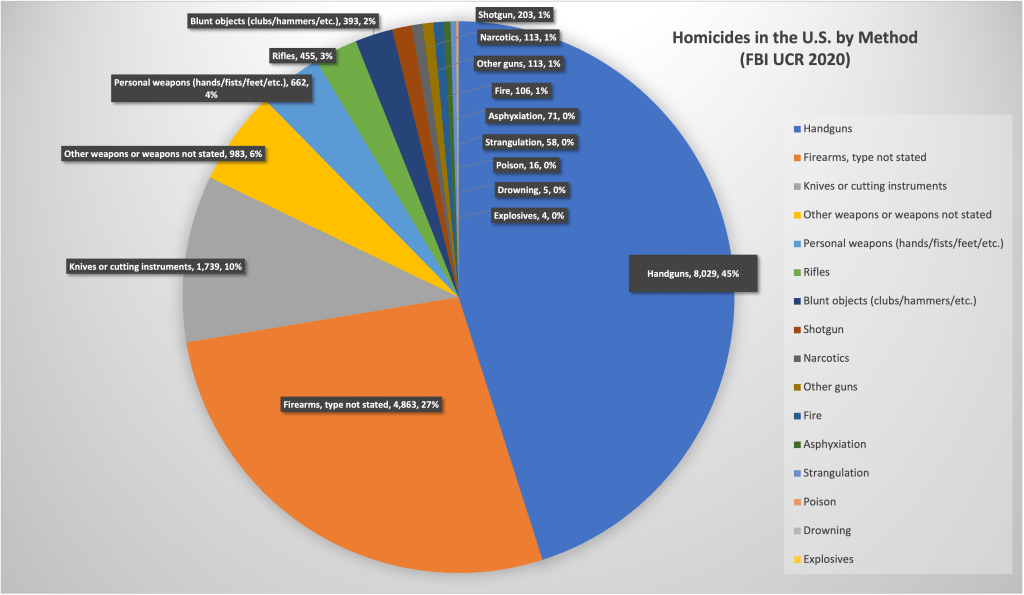Taking a look at the FBI’s UCR for the year of 2020, we can readily see that the various categories of firearm make up roughly 78% of all murders in the U.S; the other categories of murder weapon pale in comparison.